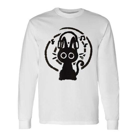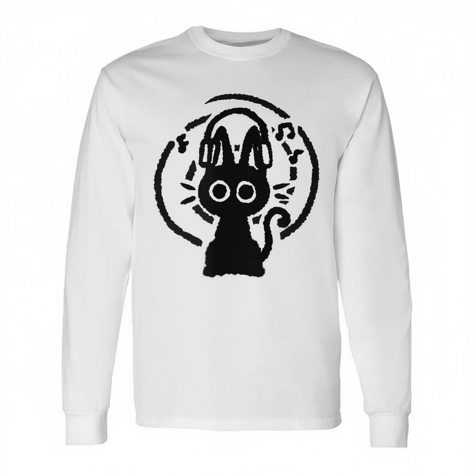 T-shirt a maniche lunghe con gatto carino con cuffie, design gattino in stile anni '90 Y2K, top alla moda unisex