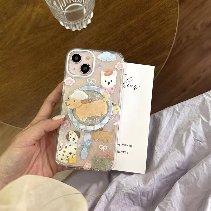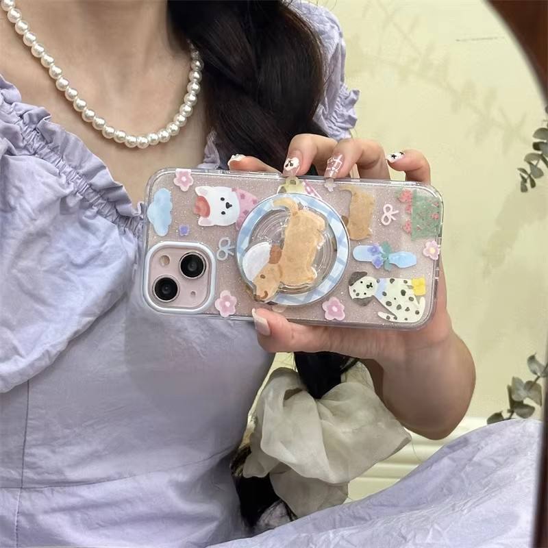 Cute Dog Magnetic Bracket Suitable for Apple 15 ProMax Phone Case 12 Double Layer iPhone 13 Full Package Flash Pink Phone case
