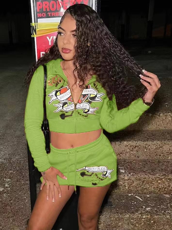 Grazioso Completo Autunnale da Donna in Due Pezzi Tuta con Stampa di Lettere Hardy Felpa Corta con Cappuccio e Zip e Gonna con Coulisse Set Due Pezzi con Gonna