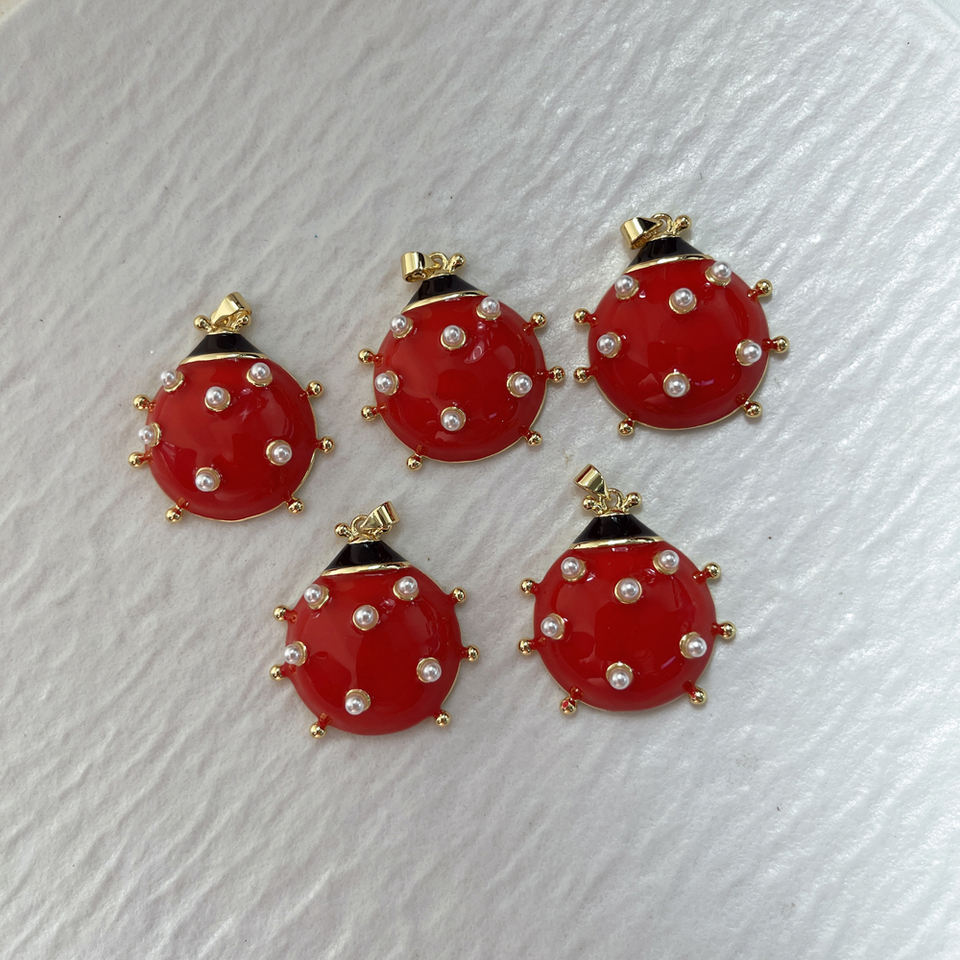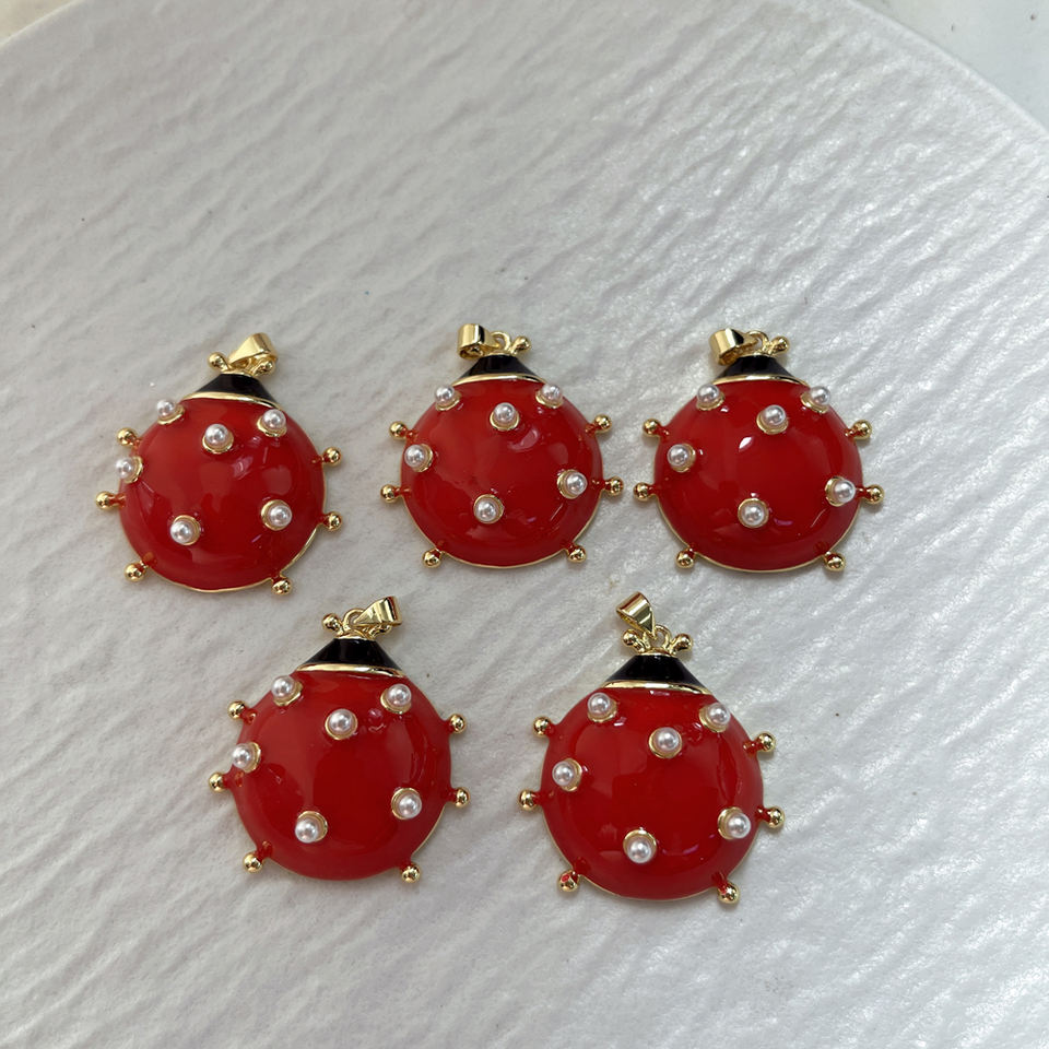 Ciondolo Charm a Forma di Coccinella in Ottone Placcato Oro con Dettagli in Perle e Smalto Rosso, Gioiello Regalo