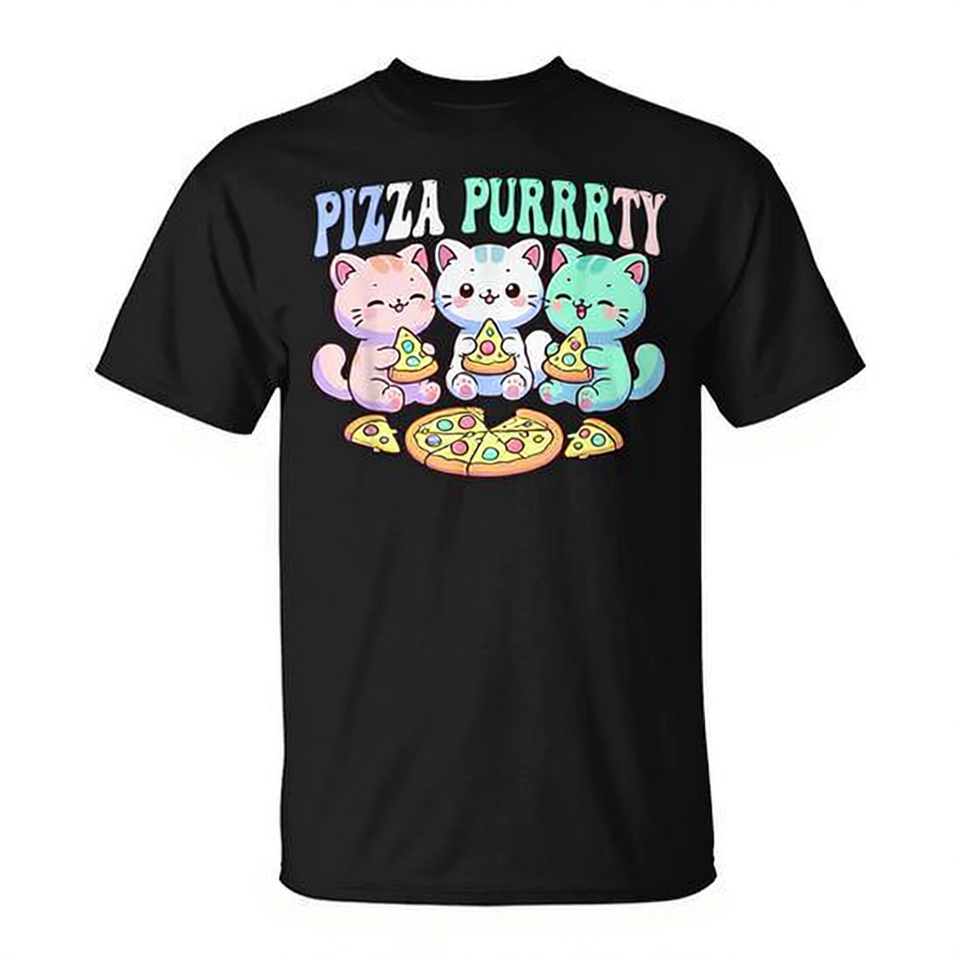 T-shirt divertente con gatti kawaii che mangiano pizza, effetto pastello e effetto ronronante, per amanti dei gatti e appassionati di pizza