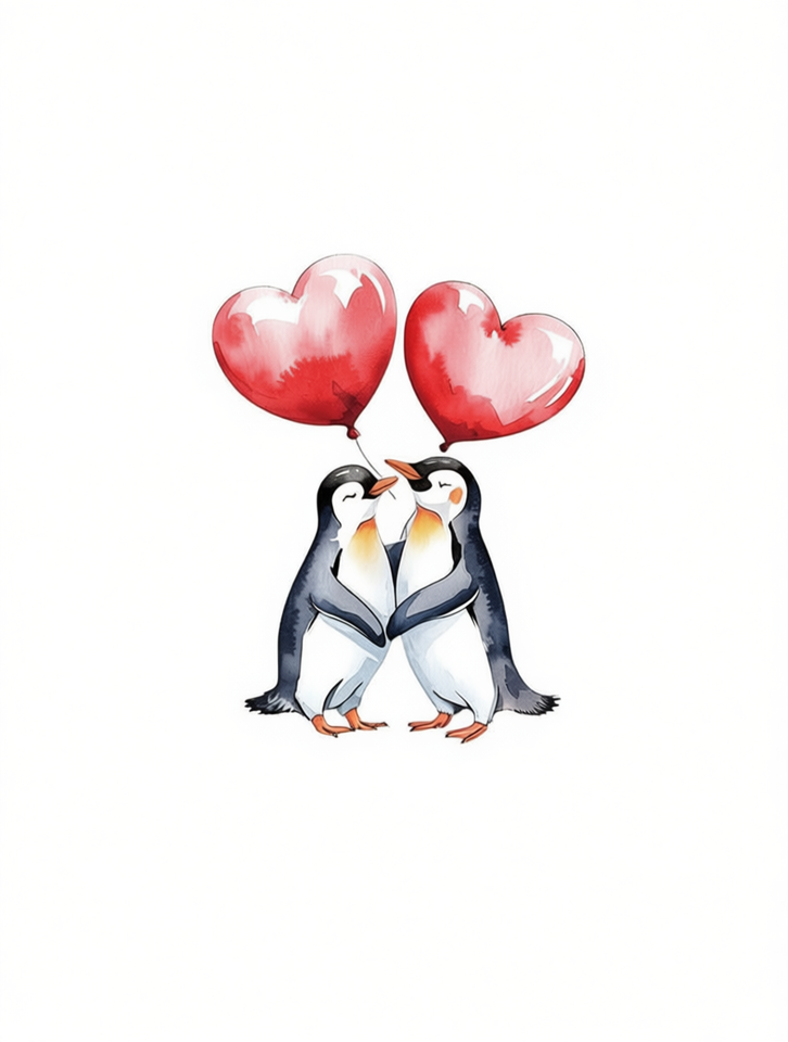 T-shirt da donna con motivo pinguini che si baciano, manica corta, girocollo, in cotone nero, casual, con design a cuore rosso e palloncino