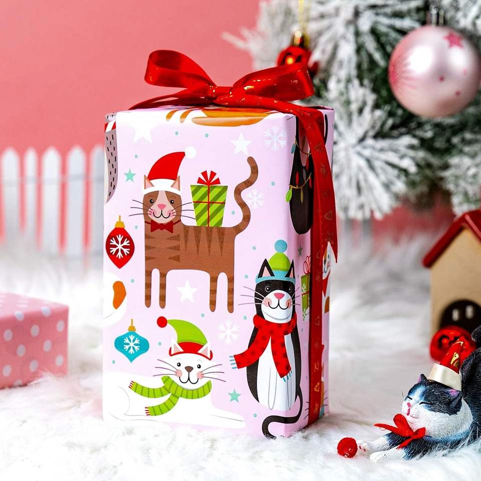 Rotolo di Carta da Regalo Natalizia con Gatto Rosa e Pois, Carta da Regalo Reversibile con Decorazioni Natalizie, Accessori per le Festività