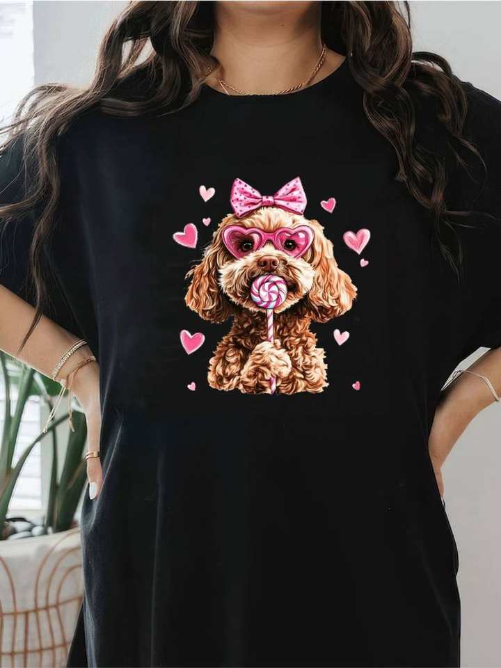 Cute Poodle Valentine's Day T-Shirt Women Short Sleeve Round Neck Printed Soft Cotton Casual Top Spring Summer Wear