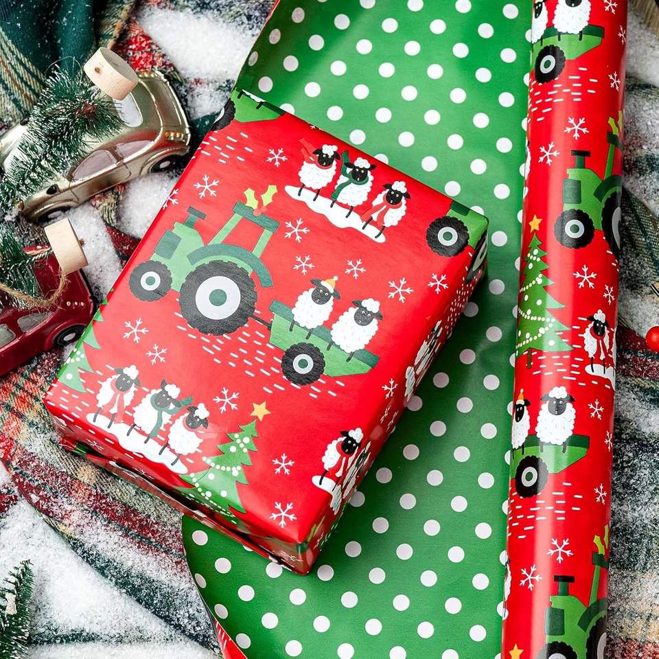 Rotolo di Carta da Regalo Reversibile a Pois Verdi con Pecore, Auto e Alberi di Natale, Tema Fattoria, per Regali di Natale e Festività