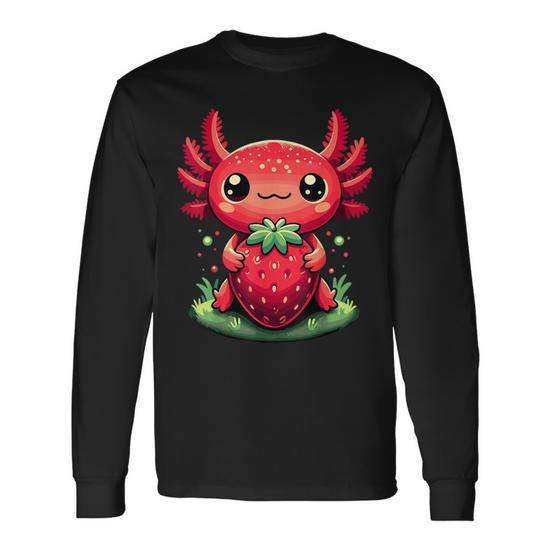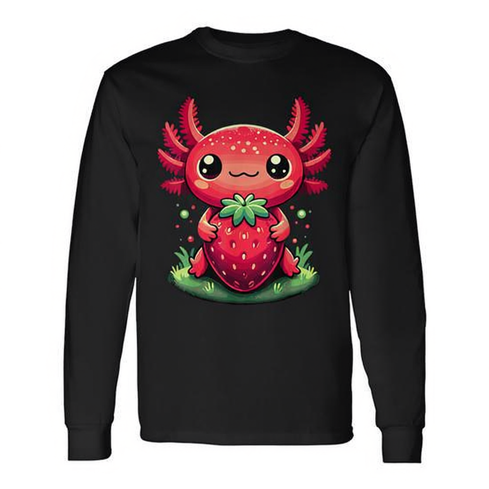 Simpatica maglietta a maniche lunghe con design a fragola e axolotl, stile kawaii estivo.