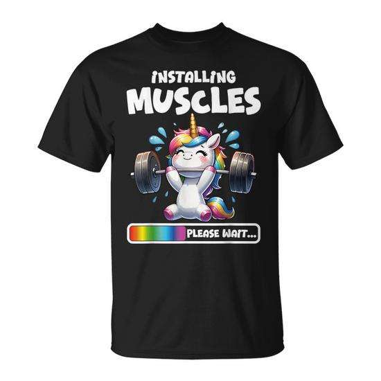 Simpatica maglietta da palestra con unicorno per allenamento e sollevamento pesi, design 'Please Wait Installing Muscles'