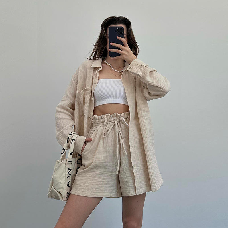 D&M Women Clothing Summer New Product Thin Long Women Shirts Set Flower Bud Lace up Shorts Casual Women Two Piece Set