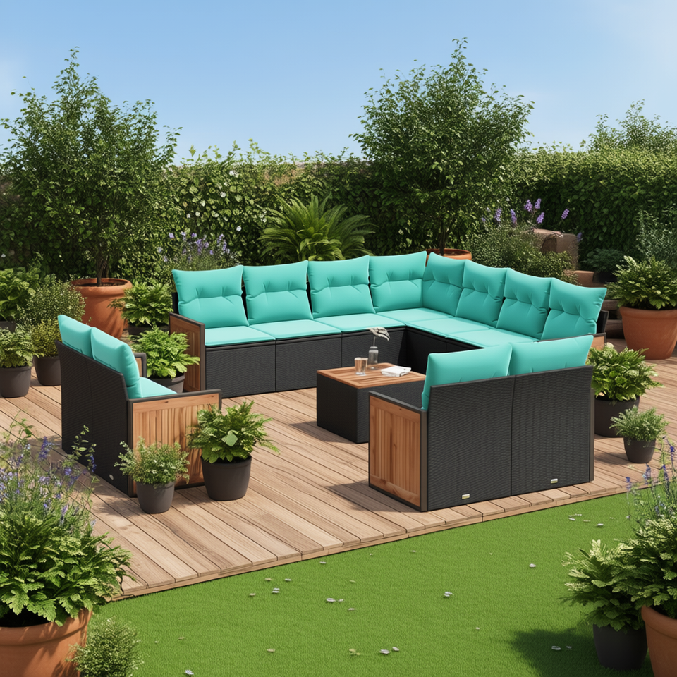 Set Divano da Esterno D0100X3ZX3J 12 Pezzi in Polyrattan Nero con Soluzione di Stoccaggio, Design Rettangolare Elegante