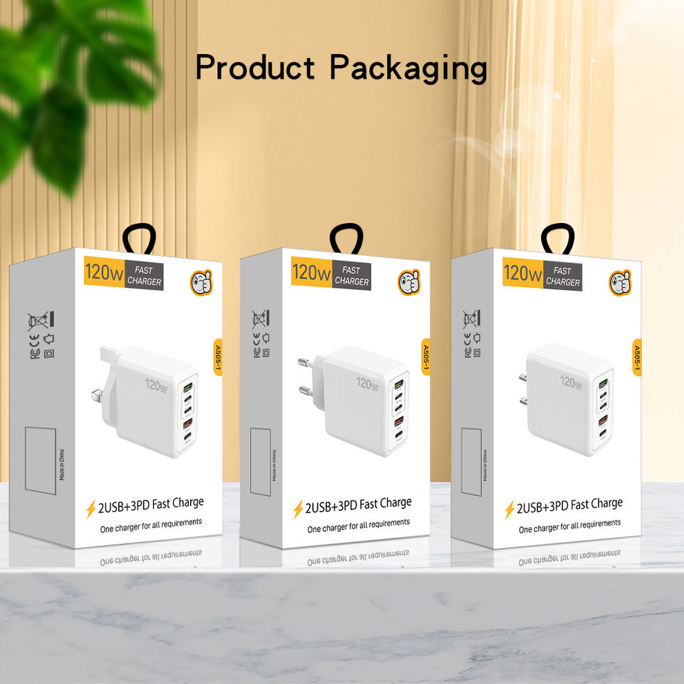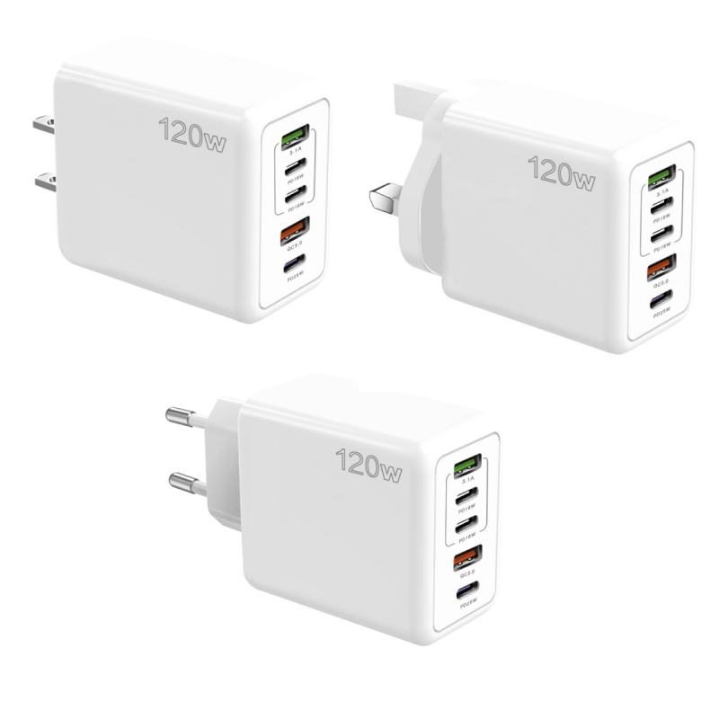 Caricabatterie DENIXI Nuovo 120W QC3.0 PD + 3USB Multi-Porta Ricarica Rapida per Telefoni Cellulari e Computer con Spine di Ricarica US/EU/UK