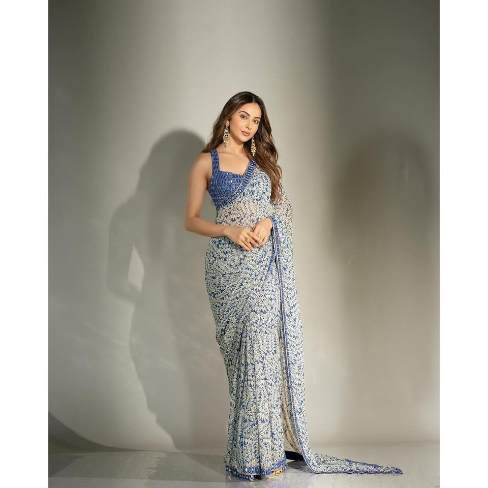 Design GEORGETTE ricamo a mano specchio in pizzo bordo sari con camicetta scucita blu