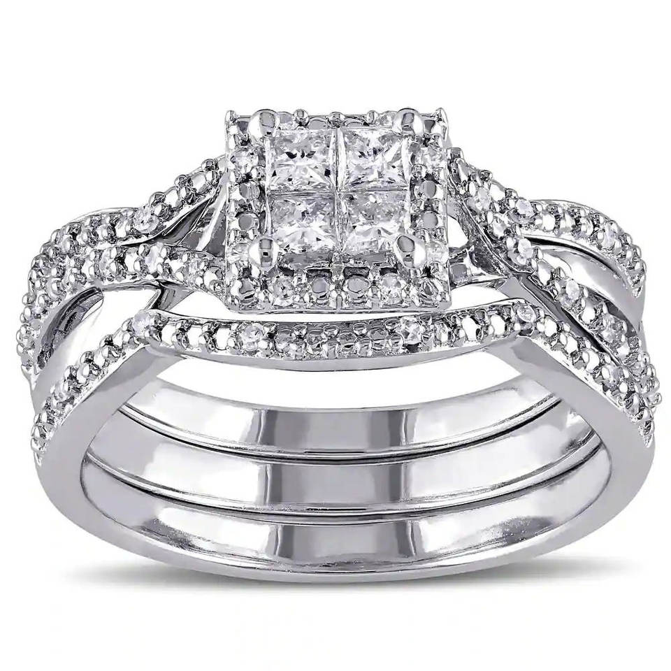 Anello di fidanzamento con diamante taglio Princess DJ047 da donna in oro bianco con diamante naturale colore D e set di fedi nuziali Halo