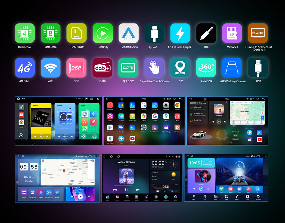 GPS, Stereo Stereo, HANDSFREE, TPMS, Amplificatore, OBD2, CarPlay, Specchio Link, Android auto, Immagine in foto, Microfono incorporato, Schermo diviso, File Manager, Auto Controllo del Volante