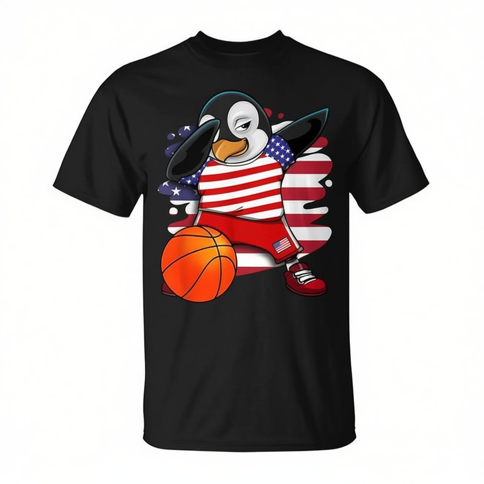 T-shirt da basket con bandiera degli Stati Uniti per i fan di Dabbing Penguin
