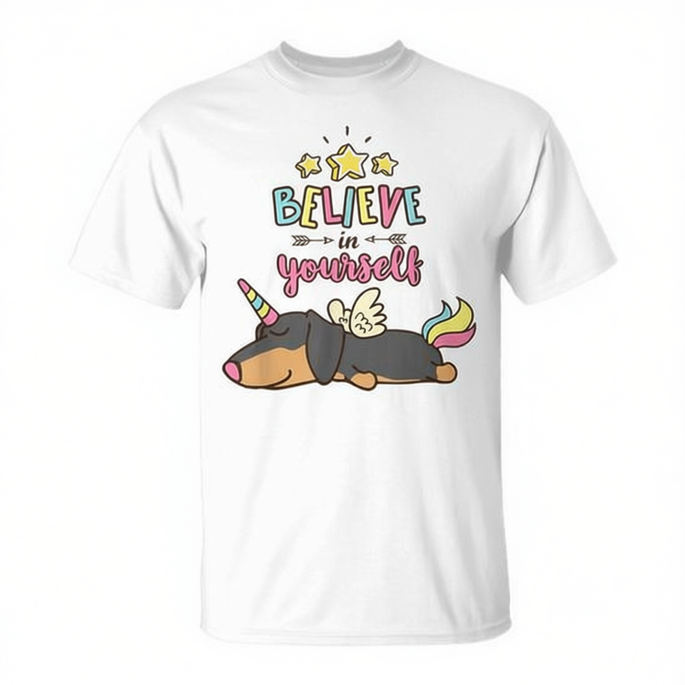 T-shirt Dachshund Unicorn Believe In Yourself per adulti, girocollo unisex, bianco, 100 cotone, stampa grafica, design motivazionale