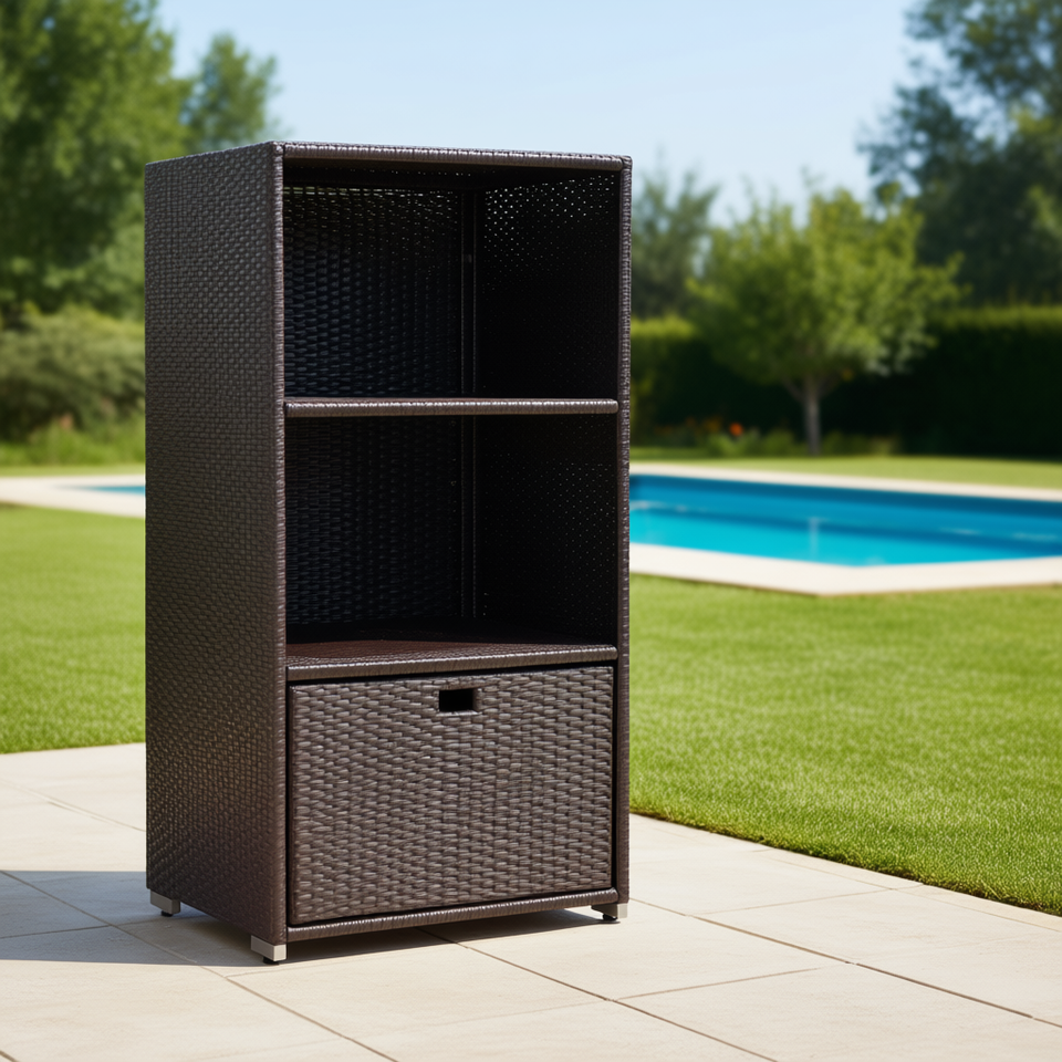 Mobiletto porta asciugamani in rattan PE marrone scuro, 47 pollici di altezza, 2 ripiani, per esterni, giardino e patio.