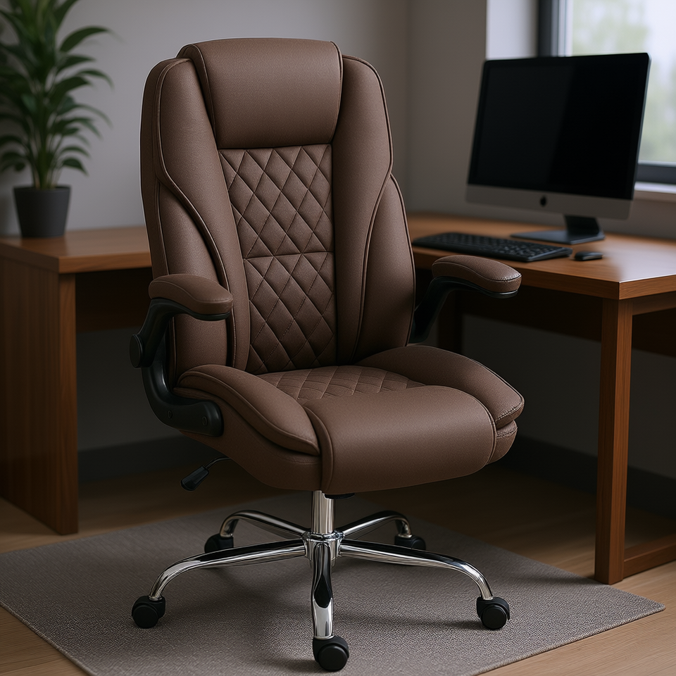 Executive Desk Chair Brown PU Leather Diamond Stitched Adjustable Armrest Swivel Office Chair for Home Use