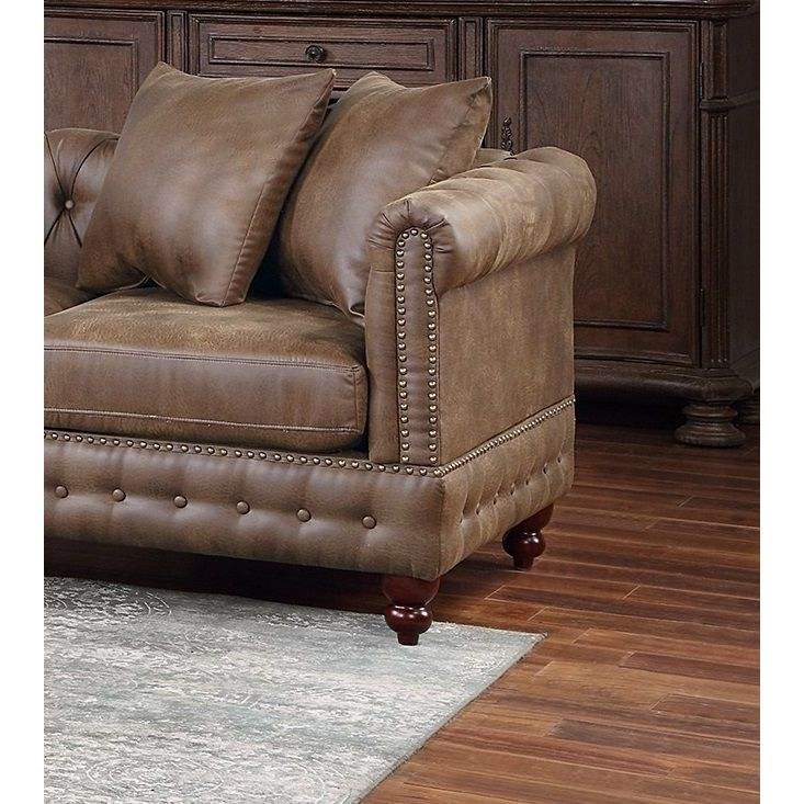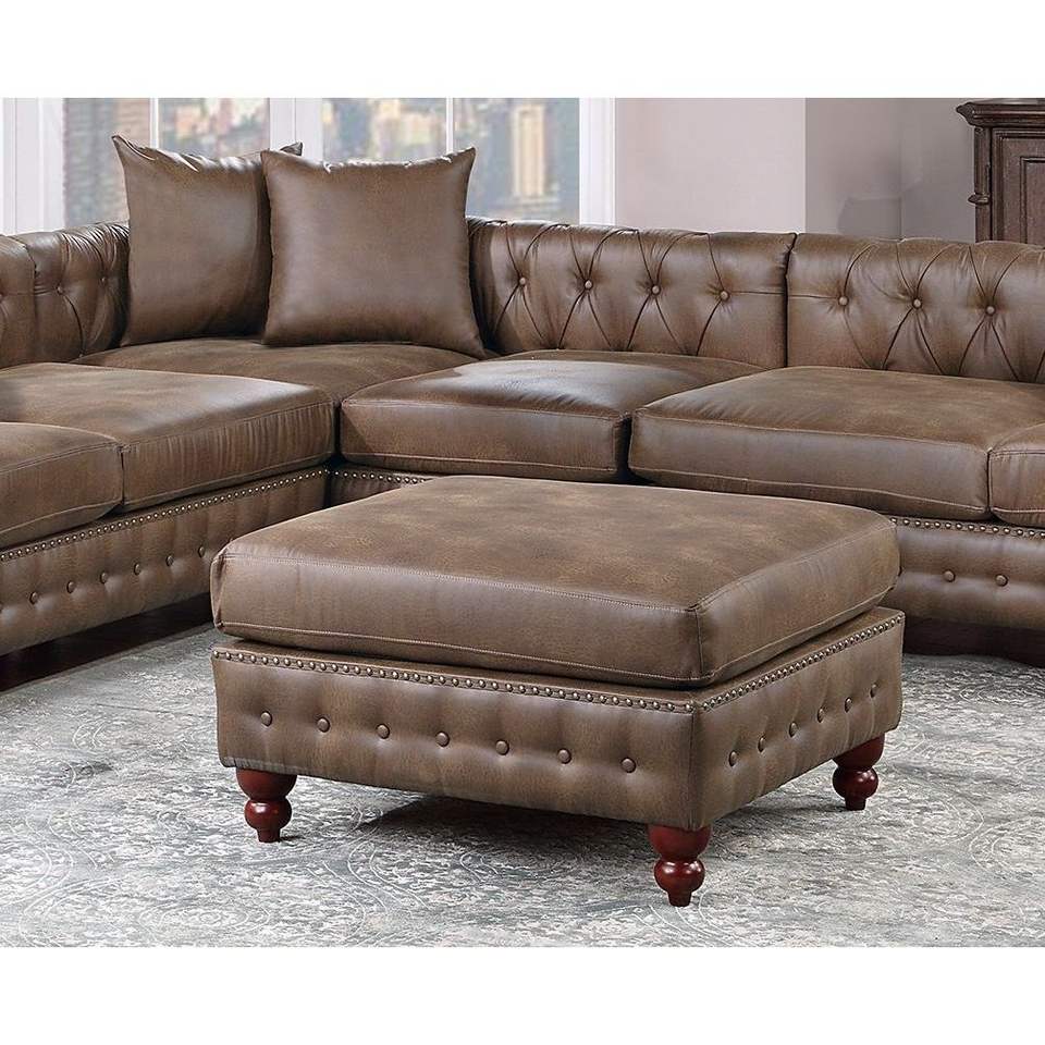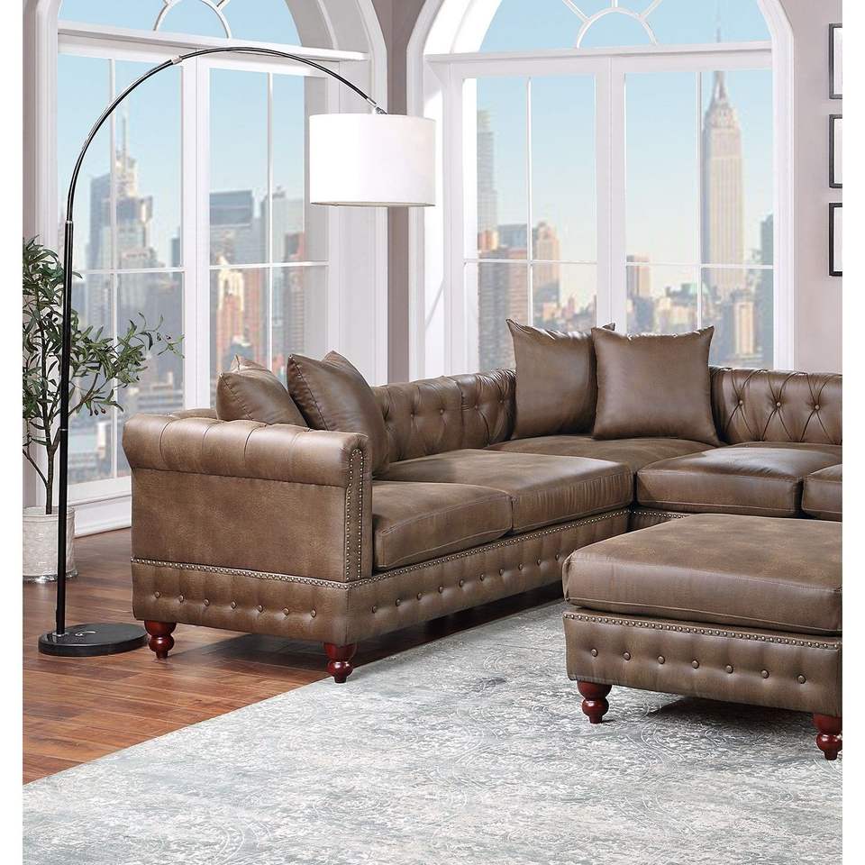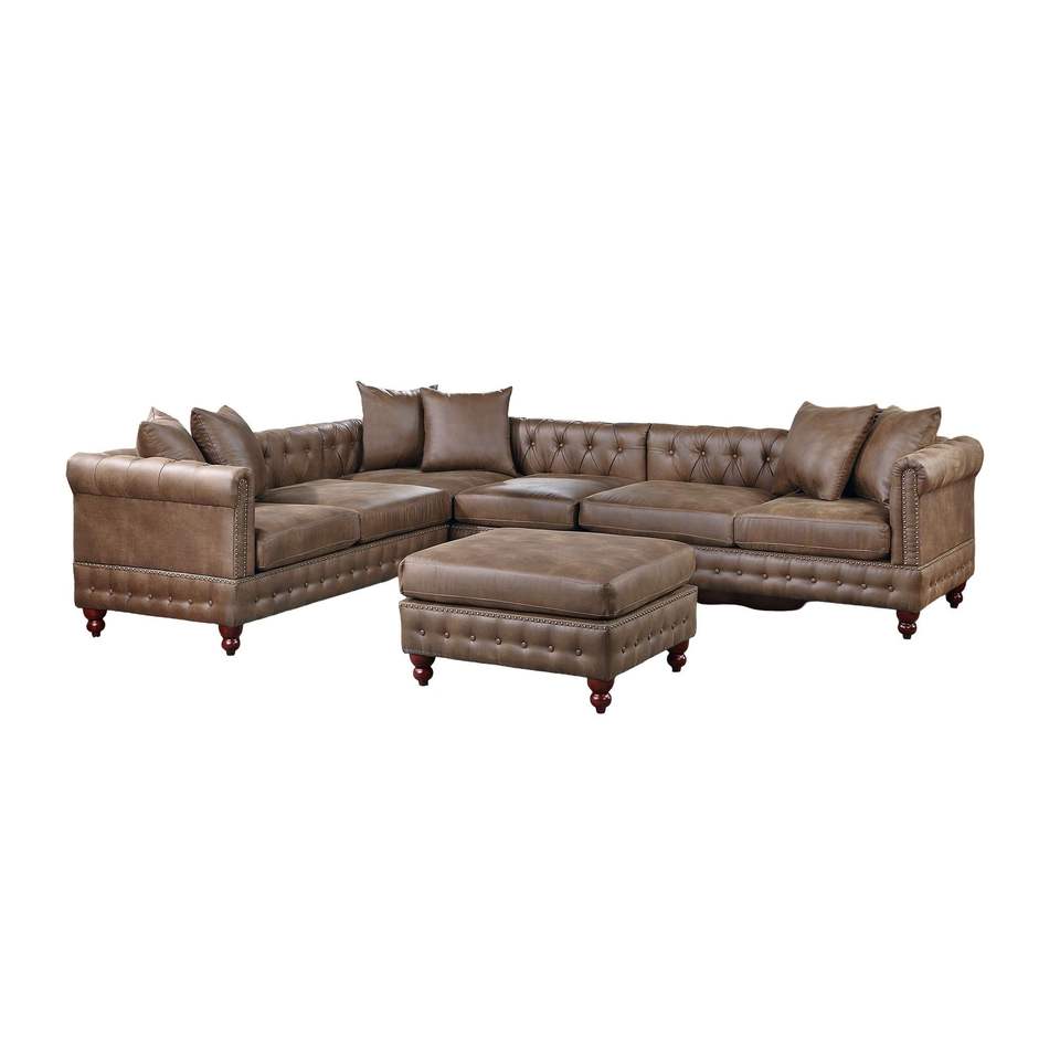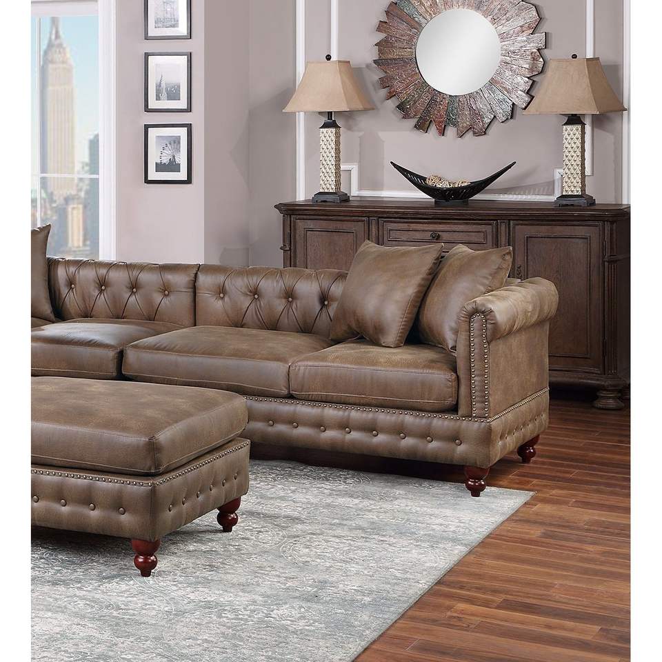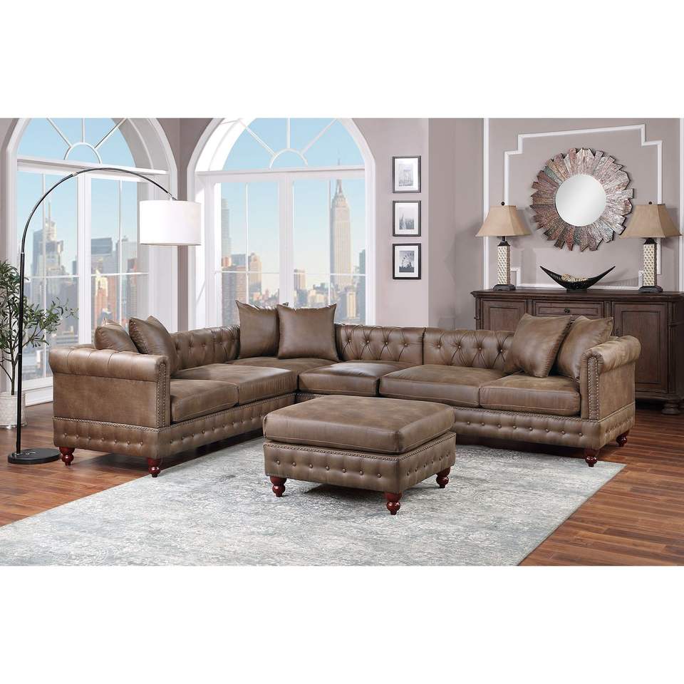 Dark Coffee Breathable Leatherette 4pc Sectional Set 3x Reversible Loveseat/Chaise 1x Ottoman Tufted Couch Pillows Living Room