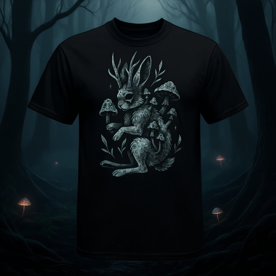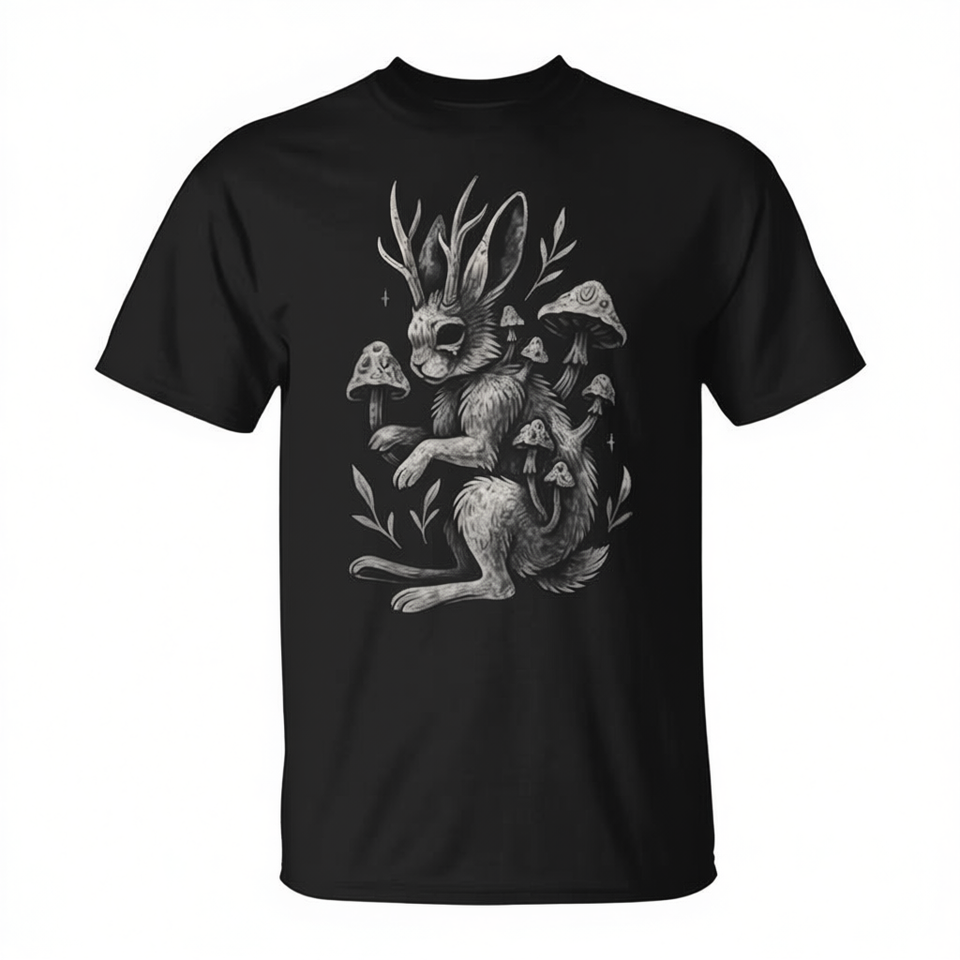 T-shirt Dark Fairycore Forest Horror con concetto Jackalope, Fungo e Coniglio - Abbigliamento Promozionale