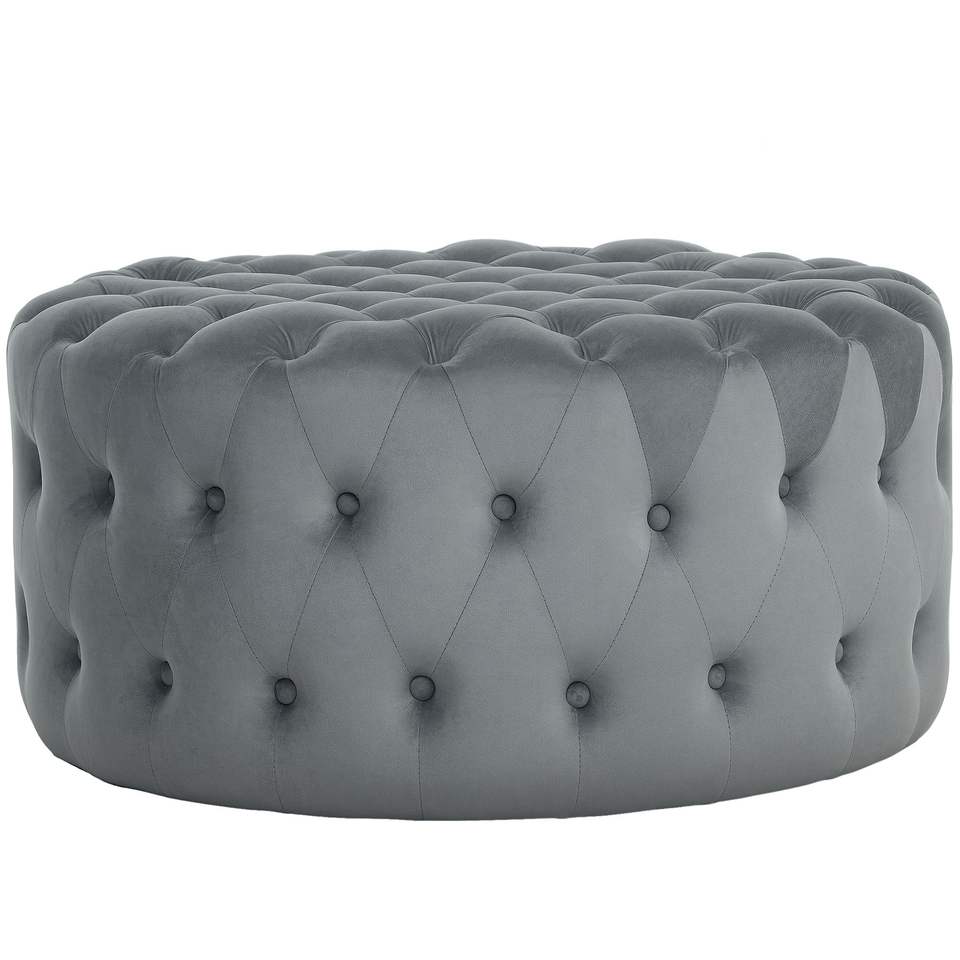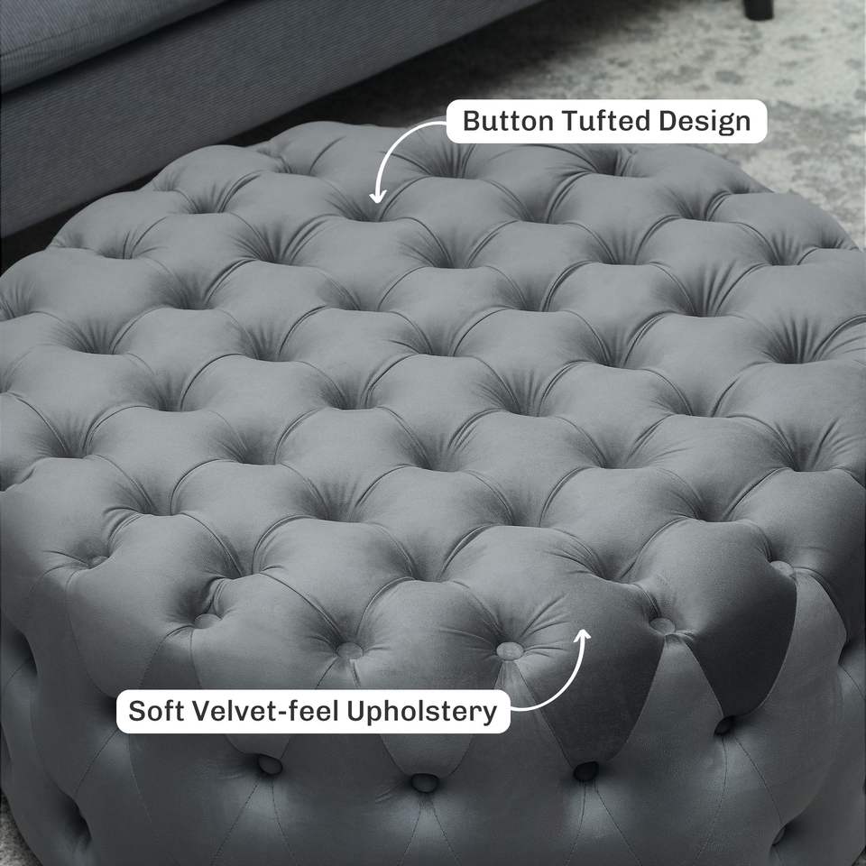 Tavolino da Caffè Rotondo Grigio Scuro con Rivestimento Effetto Velluto, Design Trapuntato a Bottoni, Seduta Imbottita
