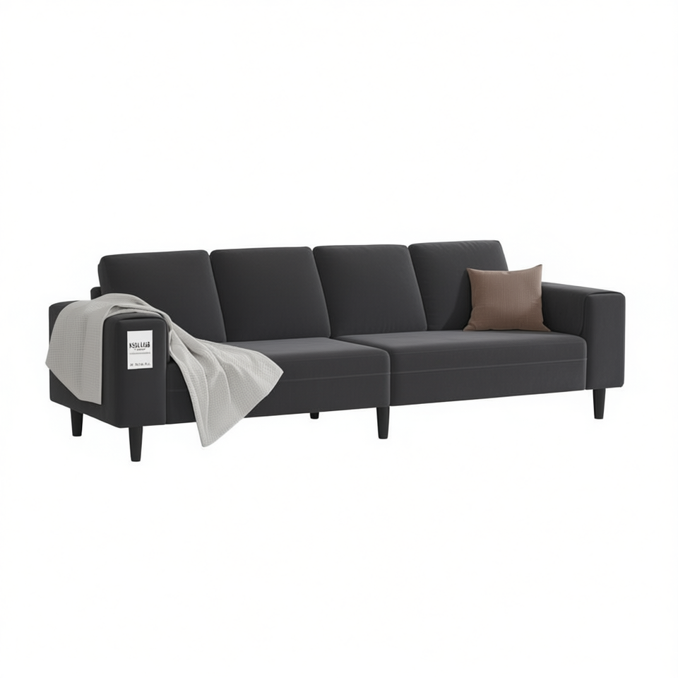 Set Divano in Velluto Grigio Scuro, Moderno per Soggiorno, Imbottito in Schiuma, Braccioli Quadrati, Gambe in Legno, Stile Schienale Morbido