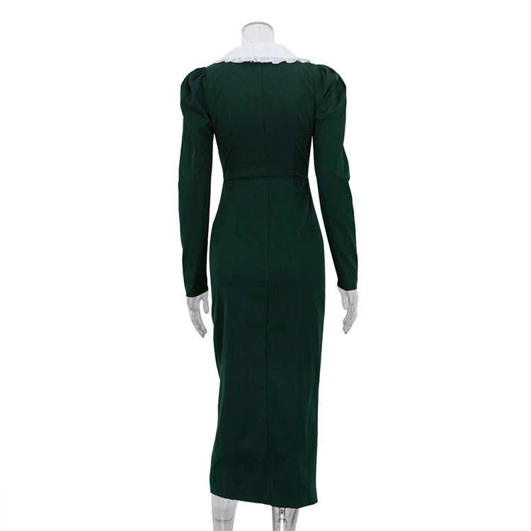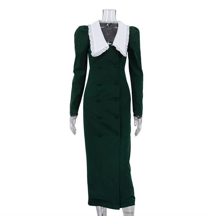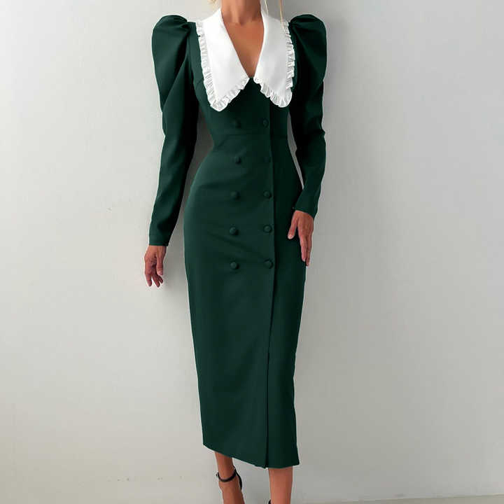 Abito da donna elegante verde scuro slim fit a vita alta, formale da ufficio, a maniche lunghe, primavera 2026, nuovo modello doppiopetto