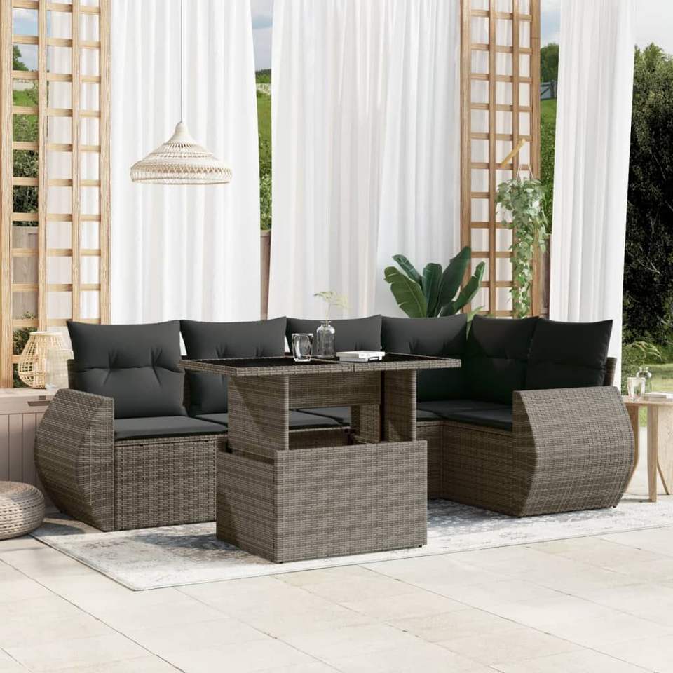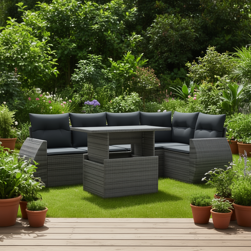 Set Divano da Giardino in Rattan Grigio Scuro con Tavolo, 6 Posti, Arredamento da Esterno dal Design Contemporaneo