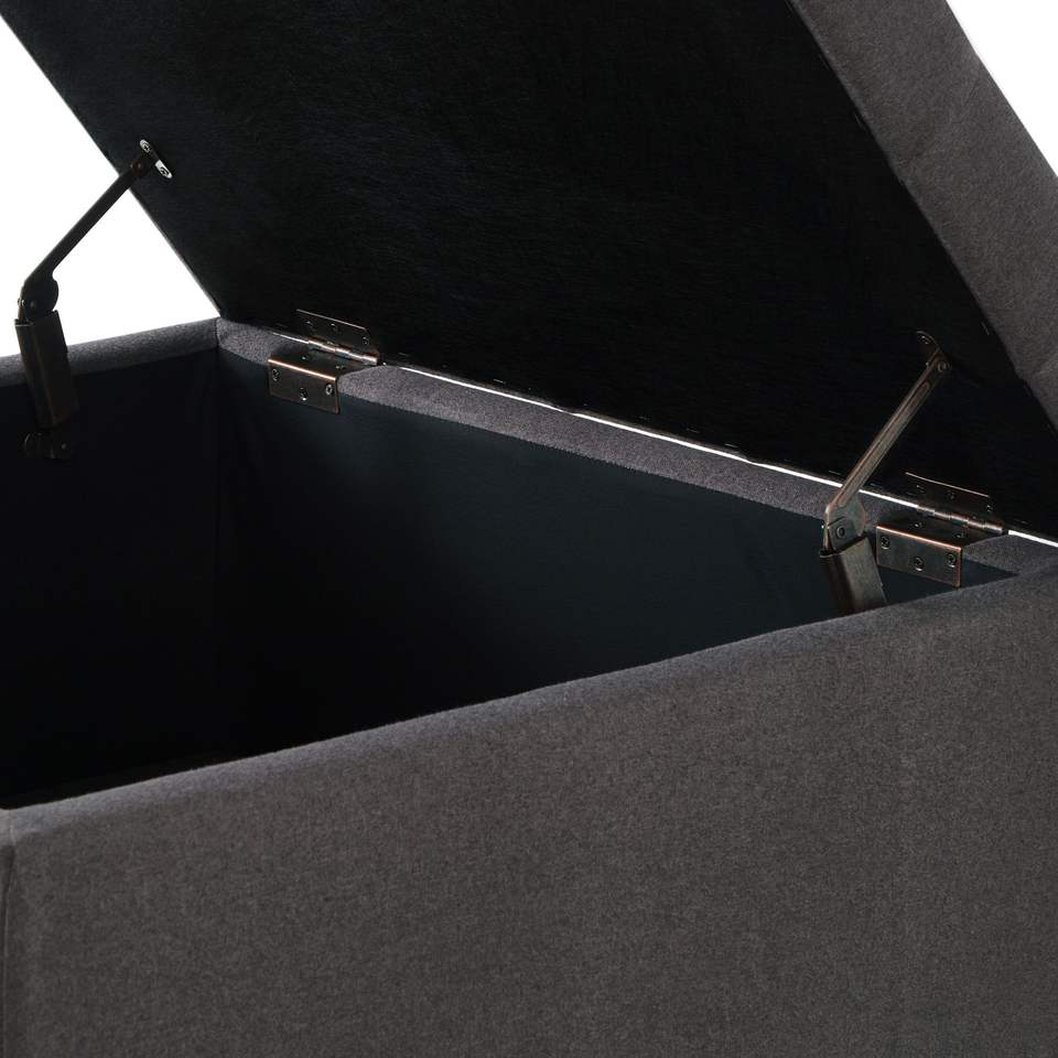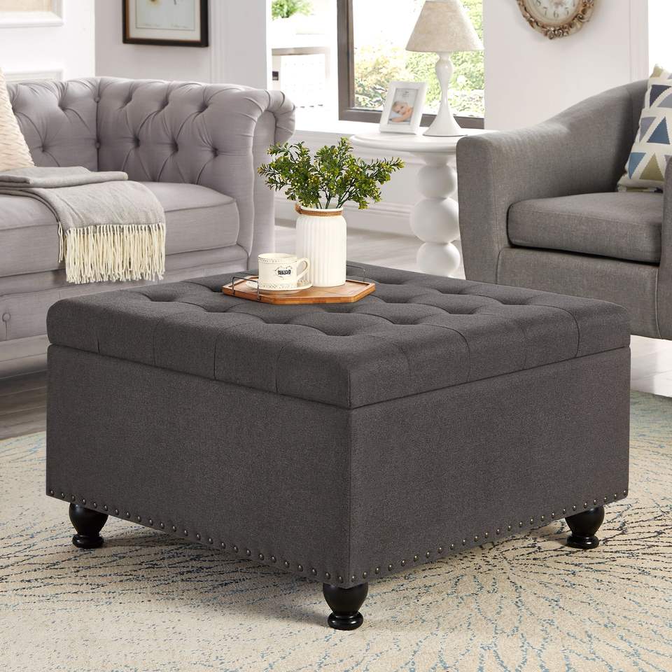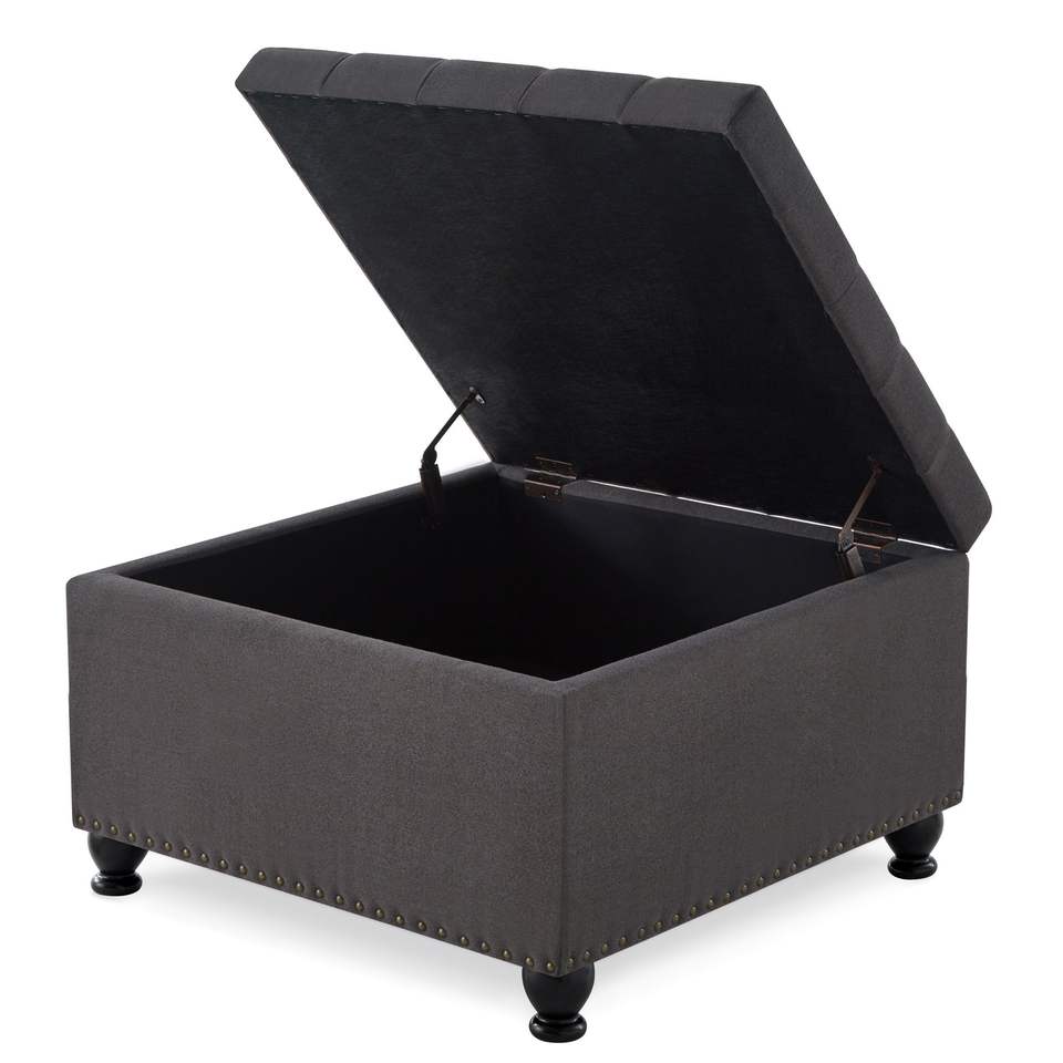 Tavolino da Caffè Grigio Scuro Imbottito con Bottoni e Finiture a Chiodi, Grande Pouf Quadrato con Vano Contenitore e Gambe in Legno per Soggiorno