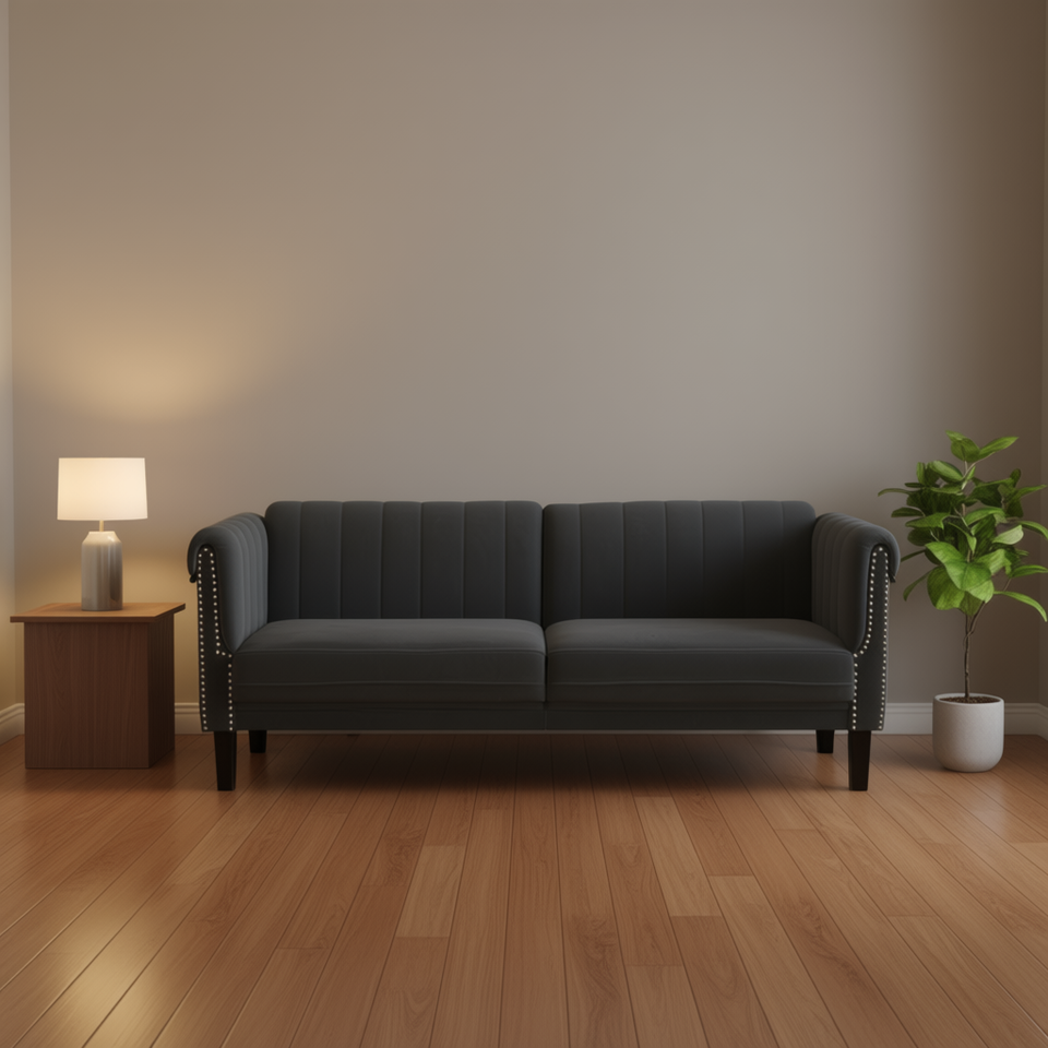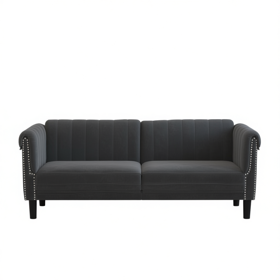 Divano Chesterfield in Velluto Grigio Scuro, 100% Poliestere, Due Posti, Schienale Rigido, Braccioli Arrotolati, Arredamento per Soggiorno