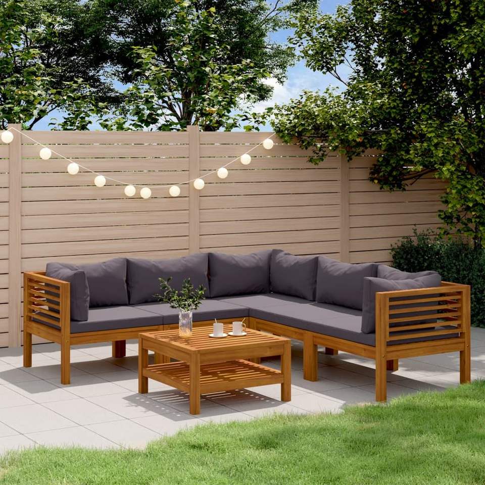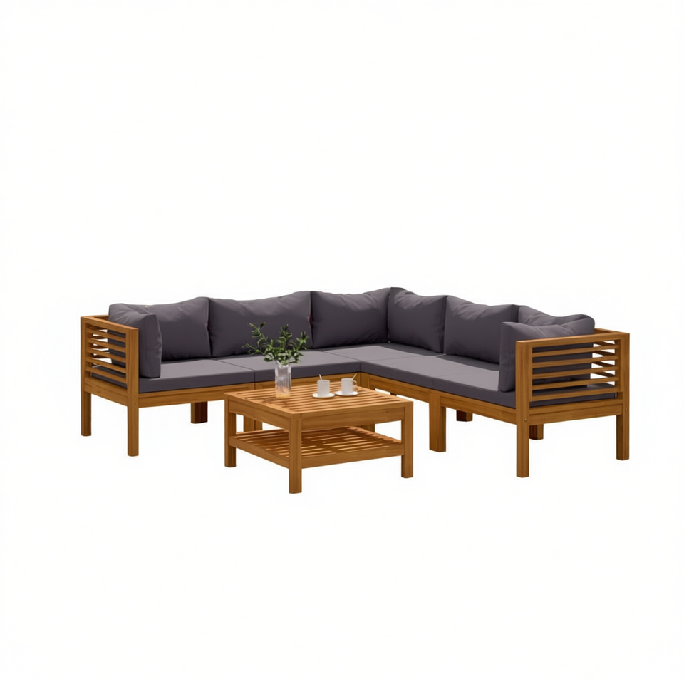 Set Lounge da Giardino in Teak con Cuscini Grigio Scuro per Intrattenimento all'Aperto, 6 Posti, Design Contemporaneo