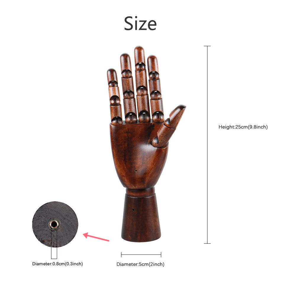Dark Red Wood Hand Mannequin Female Artist Palm with Movable Joints Drawing Arm 25 CM Right Wooden Mannequin Hand for Nails Ring