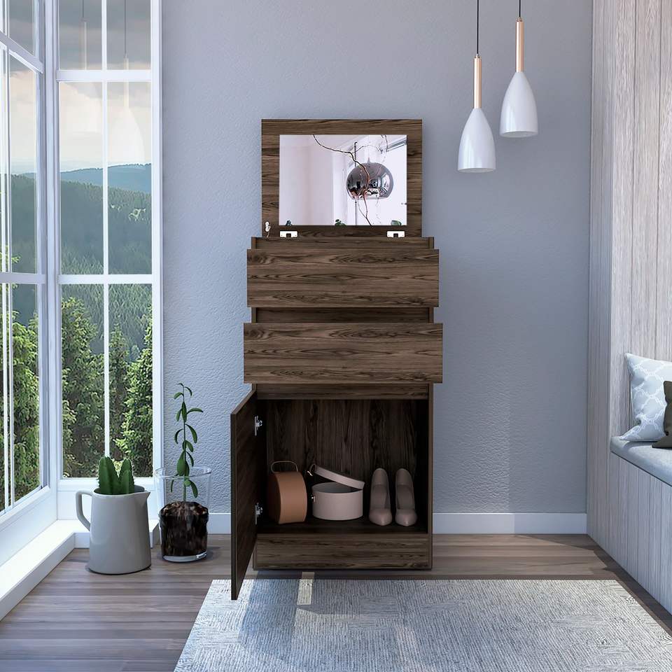 Cassettiera a una porta in noce scuro con 2 cassetti, specchio e vano portagioie da 43 pollici