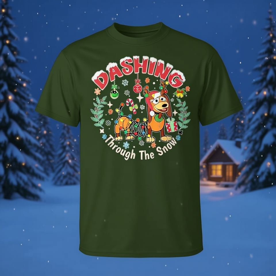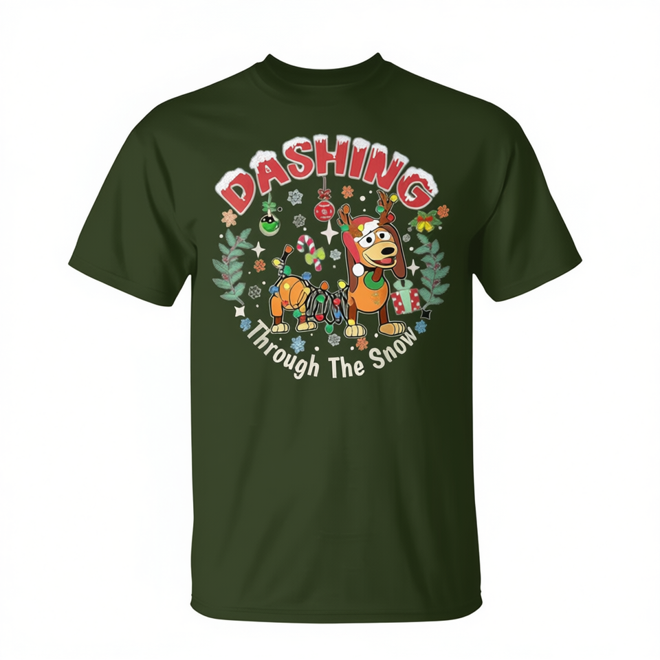 T-shirt natalizia con cane che attraversa la neve, design natalizio, girocollo, manica corta, stampa digitale, per adulti, unisex