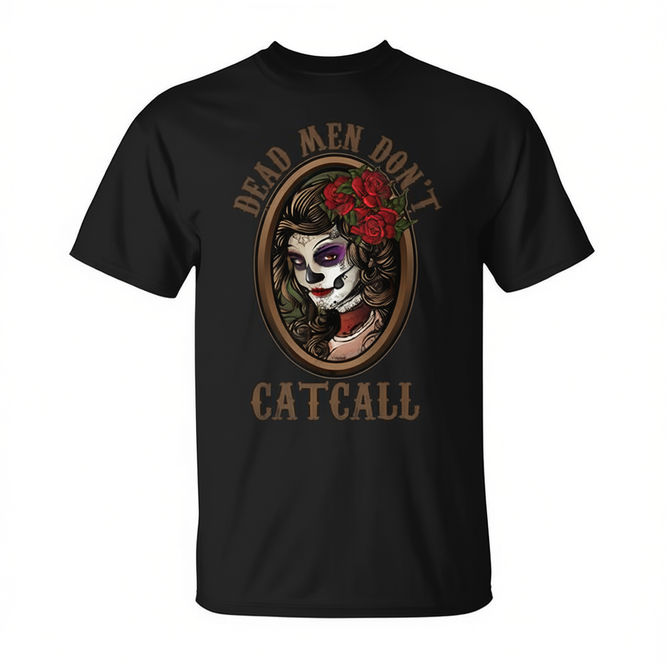 T-shirt Dead Men Don't Catcall con design grafico nero, vestibilità unisex