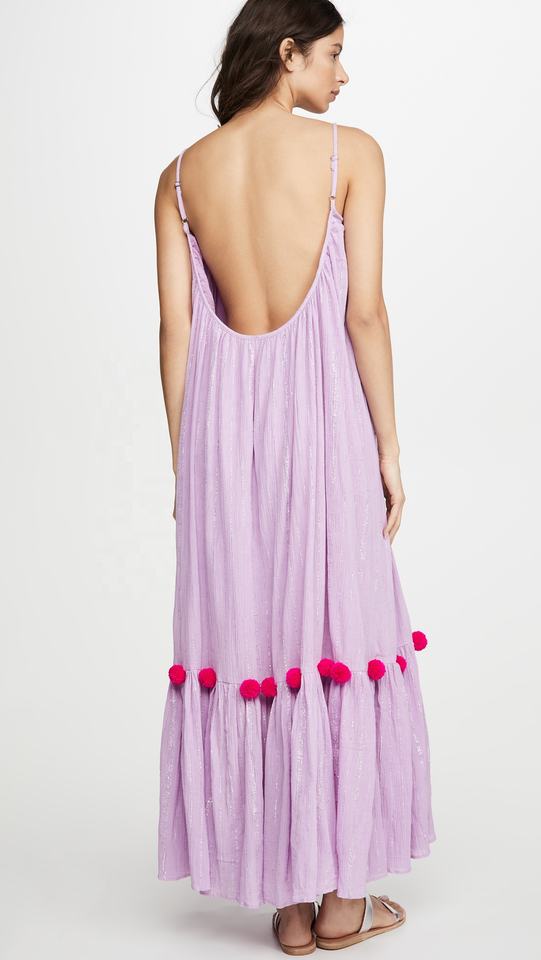 Decent Women Violet Lurex Adjustable Shoulder Strap Ruffle Hem With Pompom Decor Dress Flossy Cute Girls Casual Maxi Dress