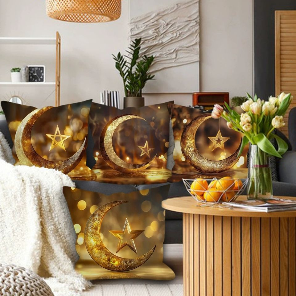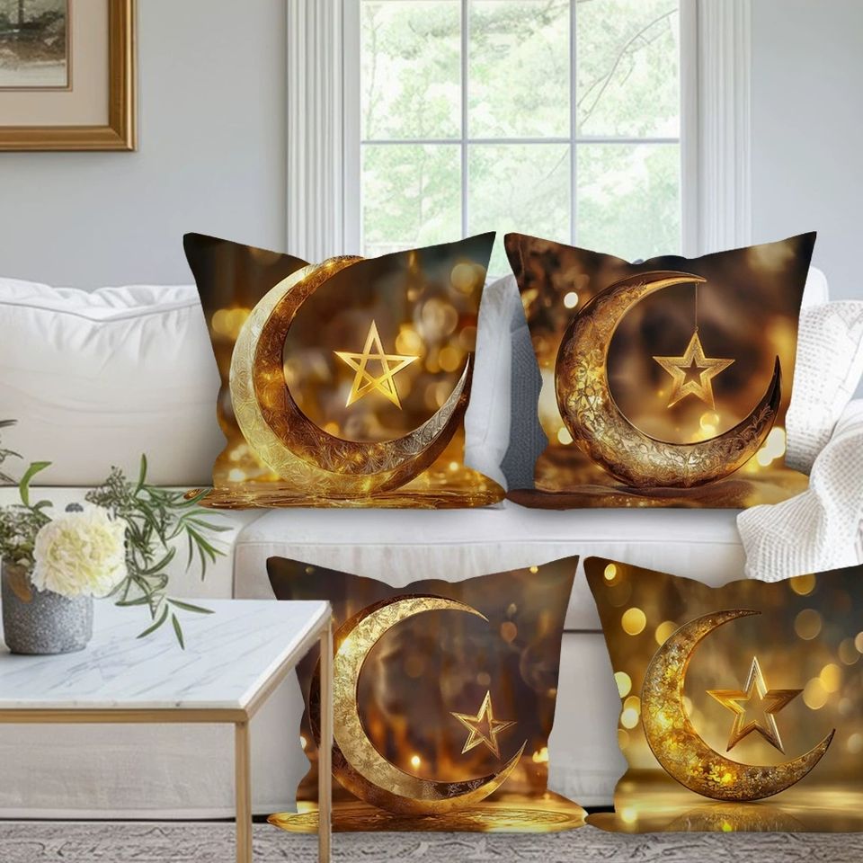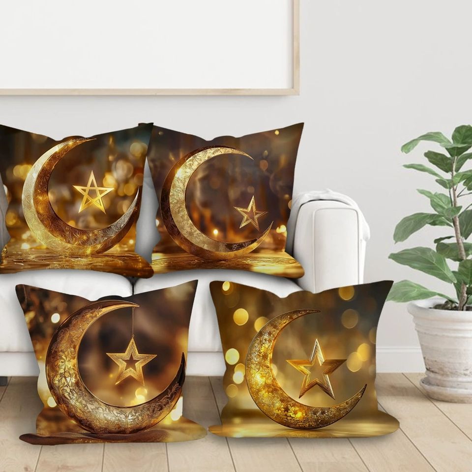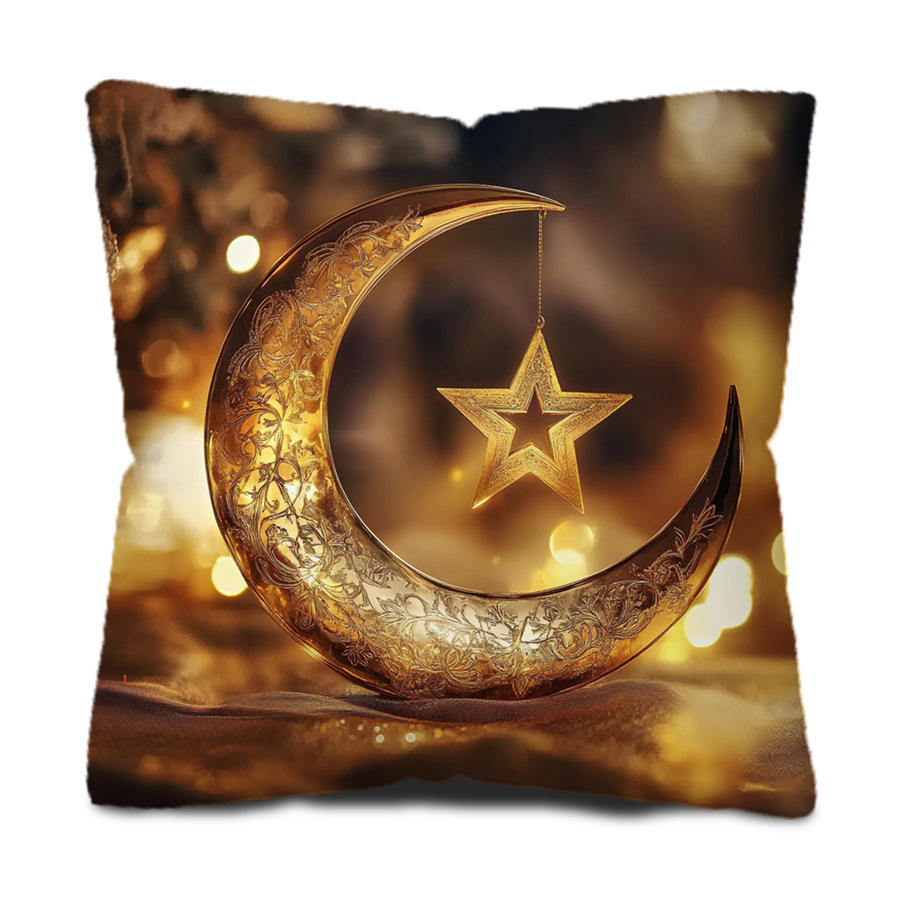 Deep Brown Bohemian Pillow Cover Featuring Intricate Islamic Crescent and Star Design Gold Embellished Accent Cushion Modern