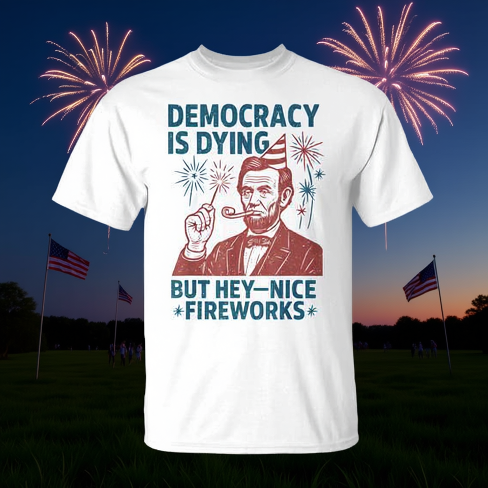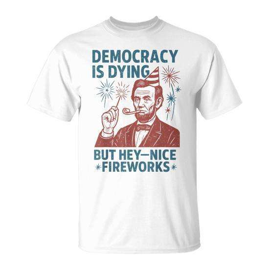La democrazia sta morendo. Bellissimi fuochi d'artificio. T-shirt Abe Lincoln per il 4 luglio.