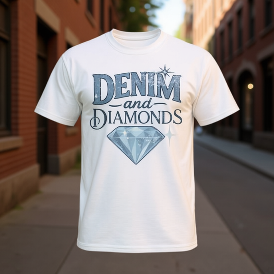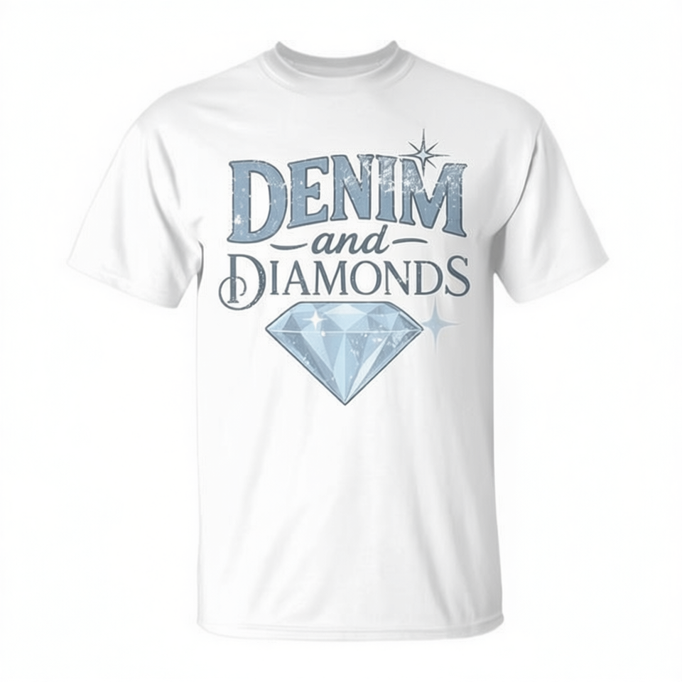 T-shirt vintage sbiadita in denim e diamanti, unisex, per adulti, in cotone medio, girocollo, manica corta