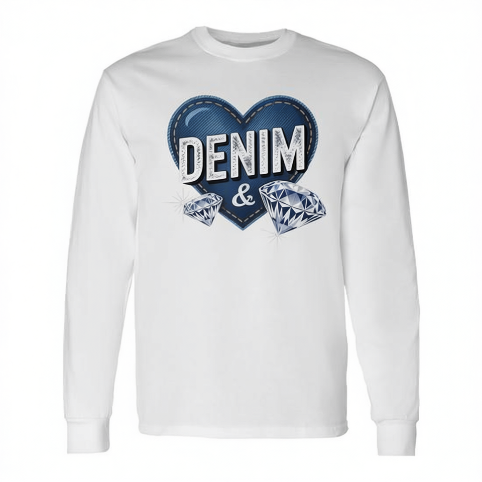 T-shirt da donna a maniche lunghe in denim e diamanti con design a cuore blu e diamanti