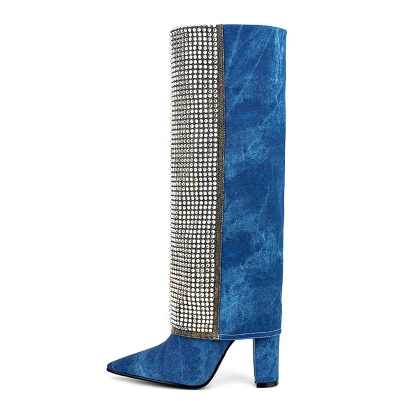 Stivali Alti al Ginocchio da Donna con Patchwork di Diamanti in Denim, Scarpe con Tacco Alto e Grosso Blu con Strass Luccicanti, Taglia Grande 45