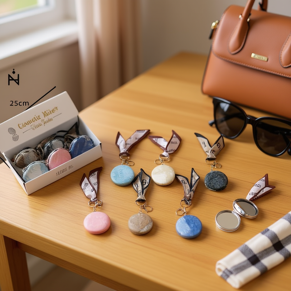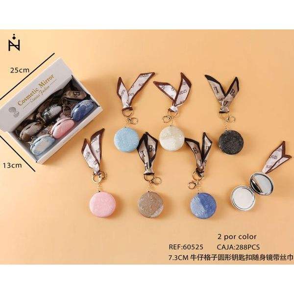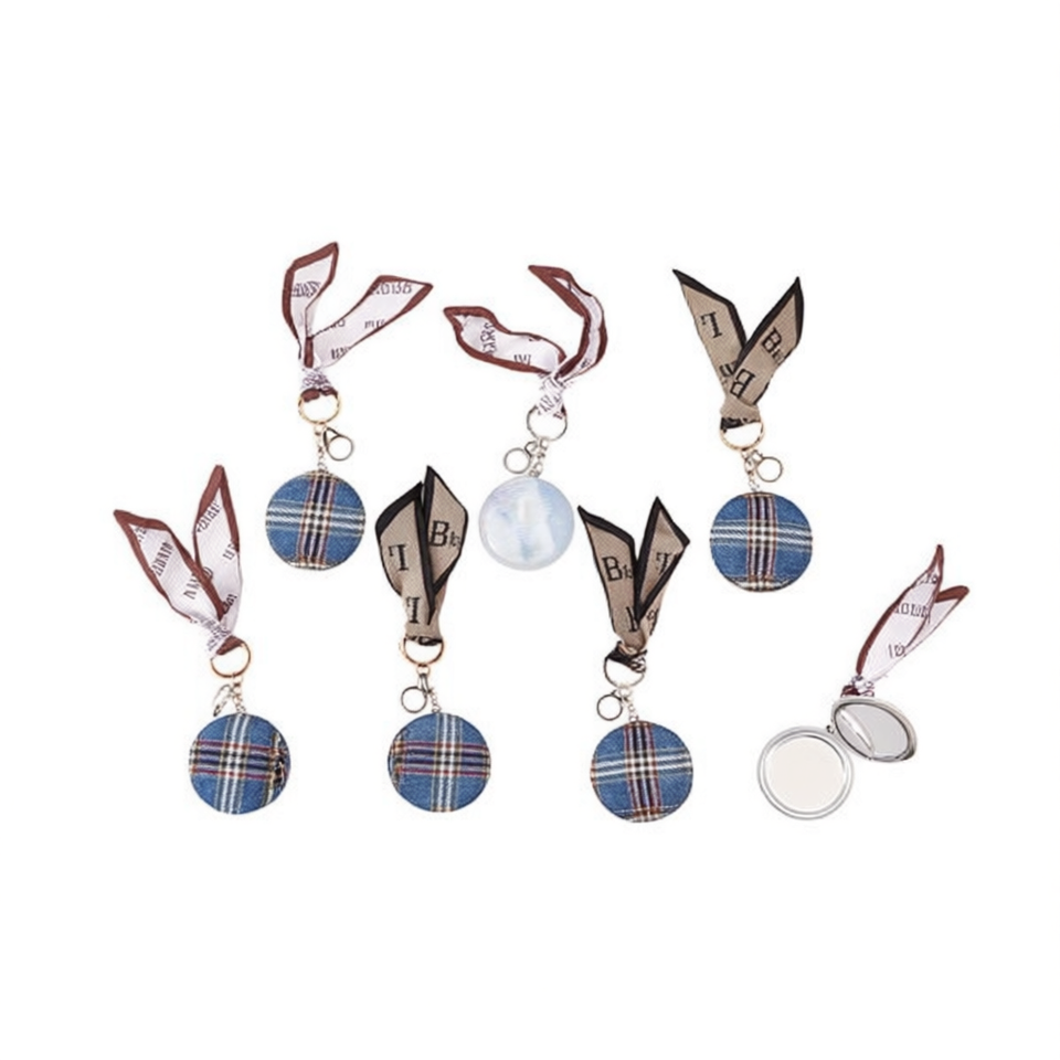 Specchietto Rotondo in Denim a Quadri con Portachiavi 7,3 CM e Sciarpa, Specchio Cosmetico Portatile per Donne, Accessori Moda