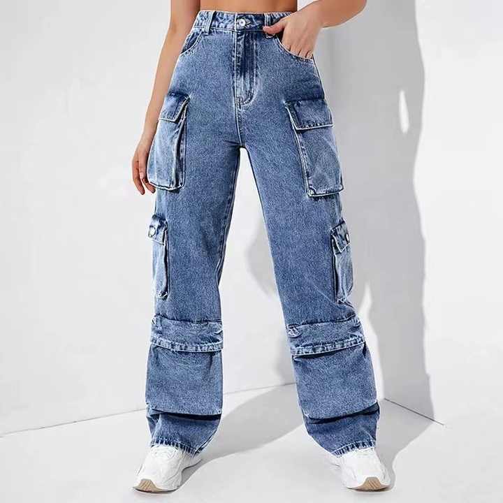 Denim Women's Clothing Ladies New Style Street Personality Cargo Pocket Pants Lady High Waist Jean Slim Women Wide Leg Jeans