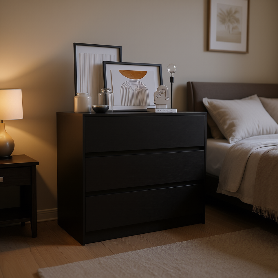 Comò a 3 cassetti Depot E-SHOP nero, moderno, per camera da letto, design autoportante con pannelli in legno