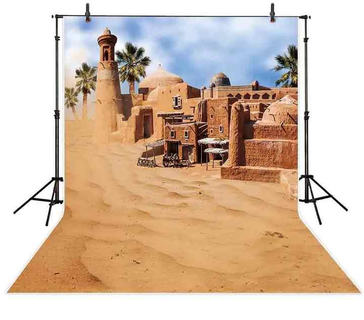 Sfondo di fotografia del deserto che costruisce vecchie favolose oasi della città con sfondo di miraggio foto ritratto