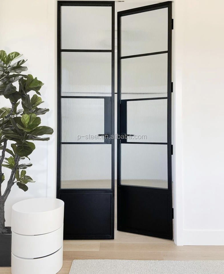 Porte in Ferro Battuto con Design Semplice, Finestre in Metallo con Vetro Grigio Temperato, Porte a Battente con Motivi a Griglia
