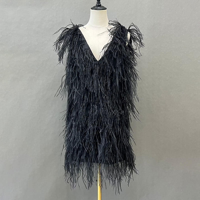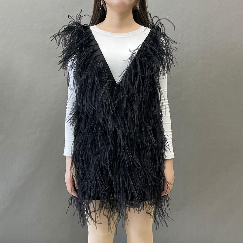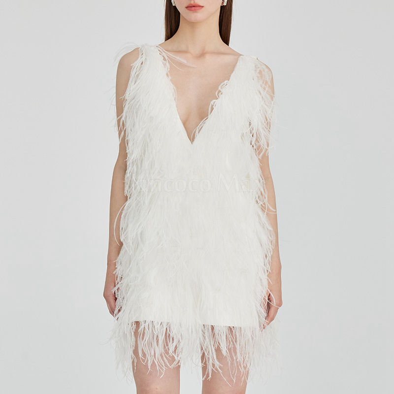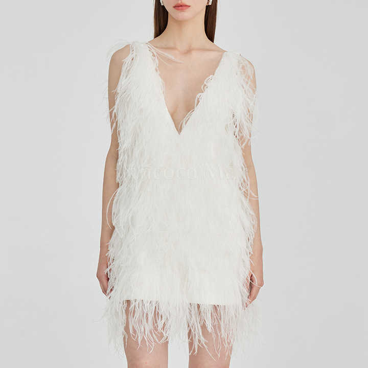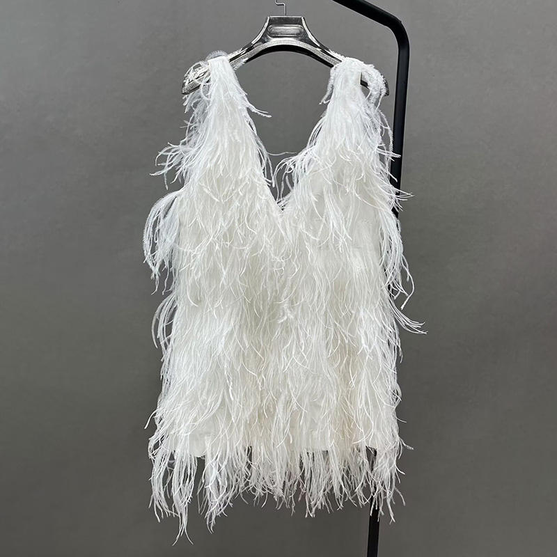 Design Ostrich Feather Dress Evening Club Women Sleeveless V Neck White Feather Dress