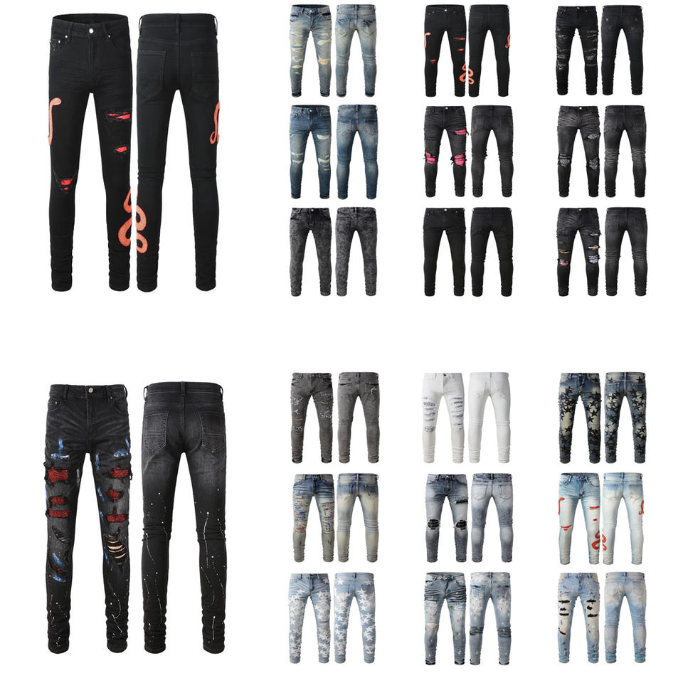 Pantaloni Biker di Design da Uomo Jeans alla Moda in Cotone Slim Ripped Stile Hip Hop Marchio Amiri Denim Nero Stonewashed Medio