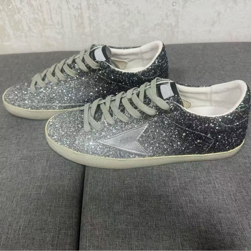 Sneakers Classiche in Vera Pelle di Design con Stella Glitterata Argentata, Traspiranti, Leggere, con Rialzo Interno, Casual e Sportive alla Moda