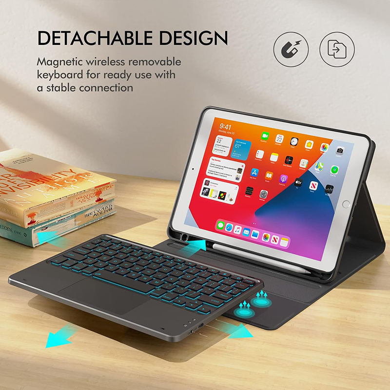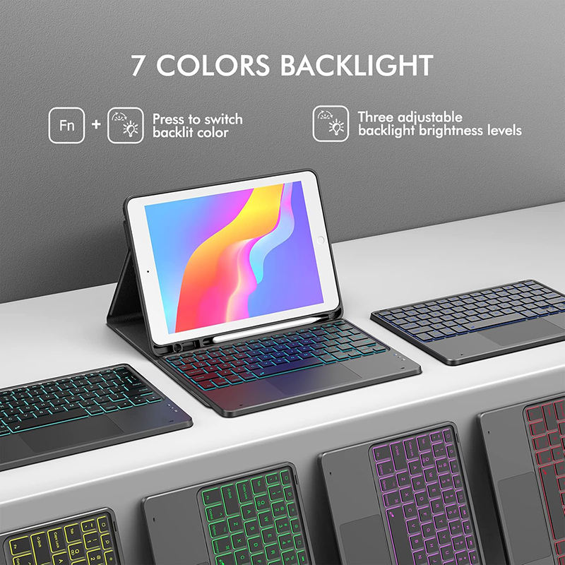 Custodia con Tastiera Rimovibile per iPad 9a/8a/7a Generazione 10.2 Pollici, Touchpad Intelligente, Retroilluminazione a 7 Colori, Compatibile con Tablet iPad