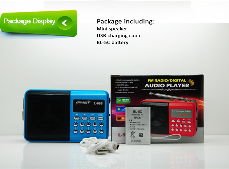 Packing include: 1*mini radio, 1*rechargeable battery, 1*USB charging cable,